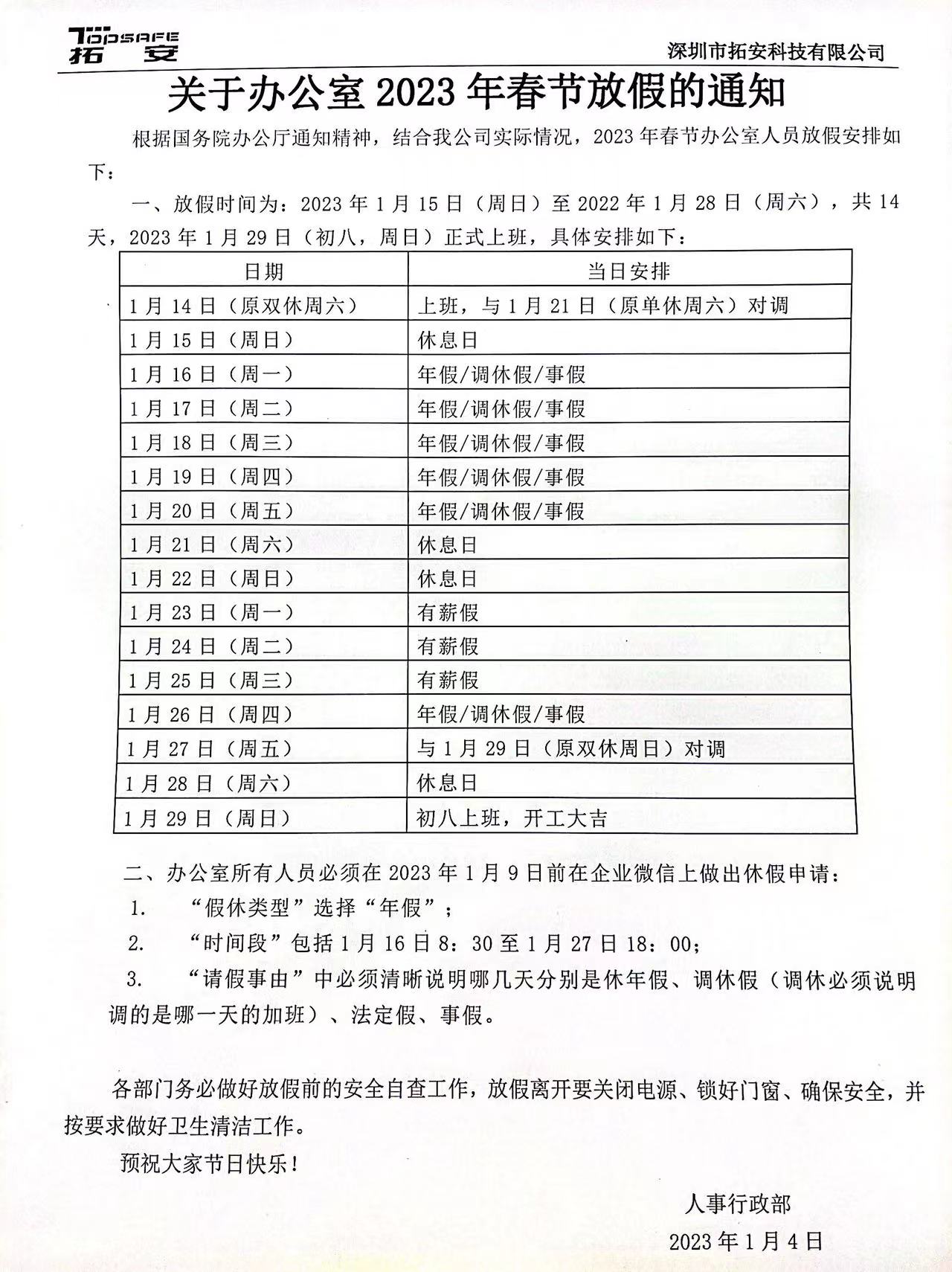 關(guān)于拓安2023年春節(jié)假期安排通知